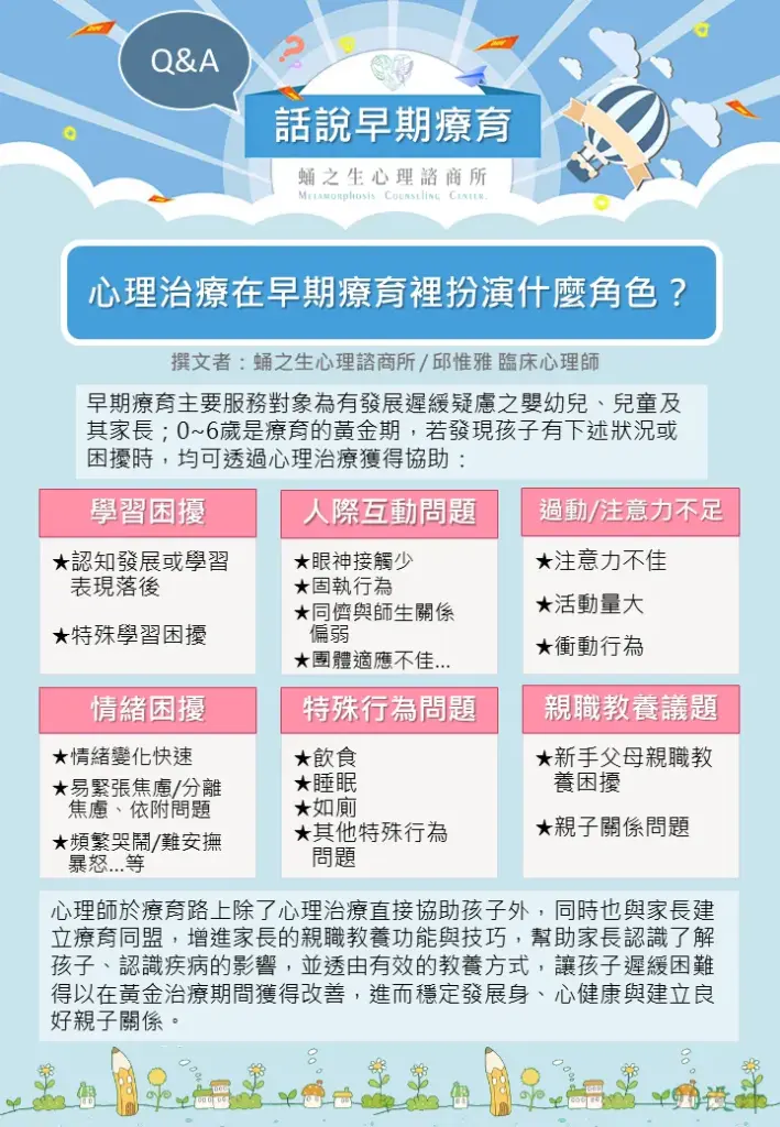 心理師於早期療育路上,除了心理治療、直接協助孩子外,同時也與家長建立療育同盟,增進家長的親職教養功能與技巧
