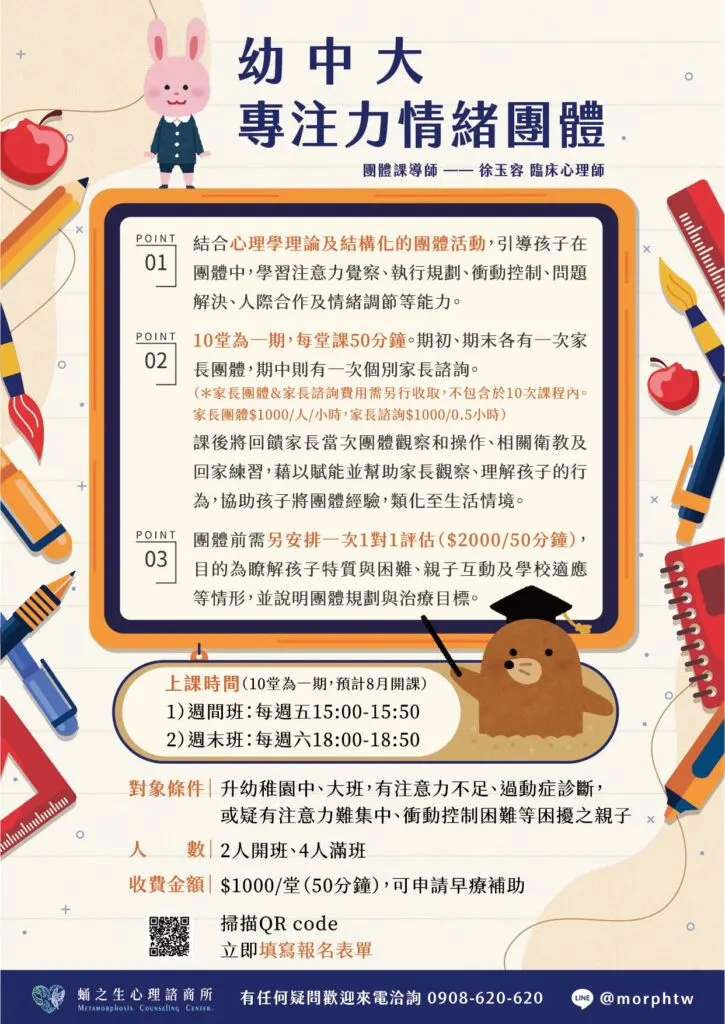 本所的徐玉容臨床心理師,為升幼稚園中、大班,有注意力不足過動症診斷,或疑有注意力難集中、衝動控制困難等困擾之親子,舉辦「幼中大 專注力情緒團體」課程方案,歡迎有興趣的家長填寫下方報名表單、參與課程。