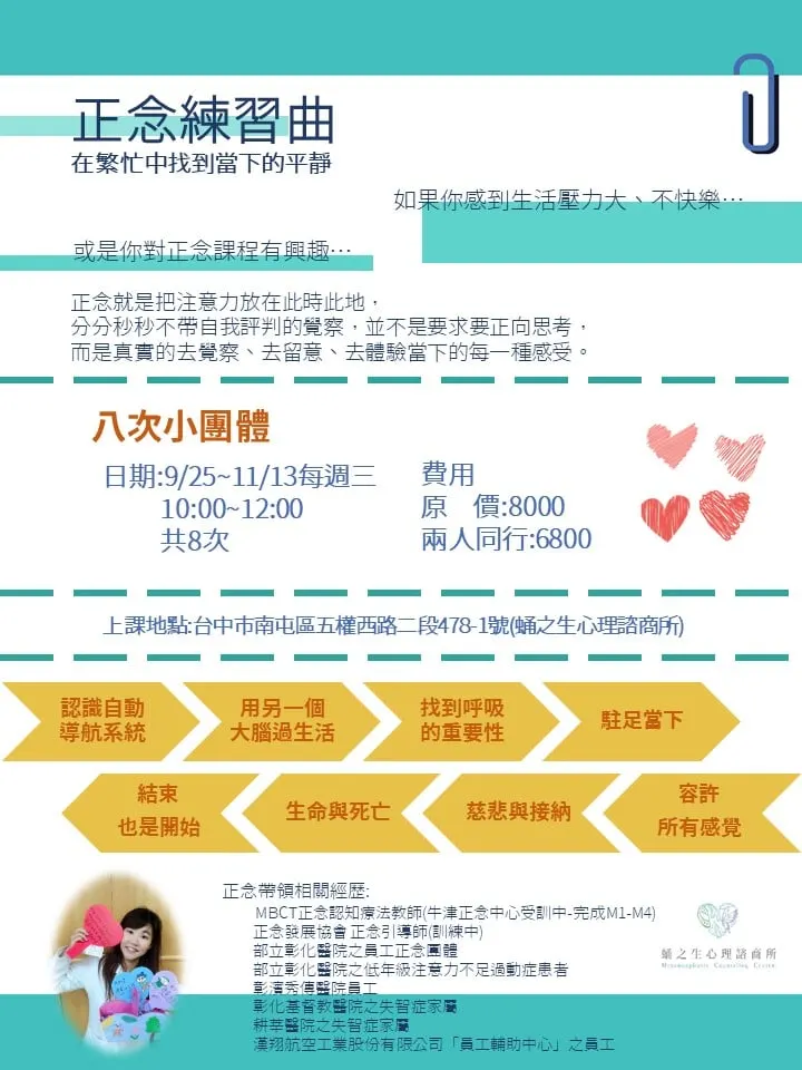 雅之老師正念課程熱烈報名中,還在猶豫嗎,名額僅剩兩人囉
