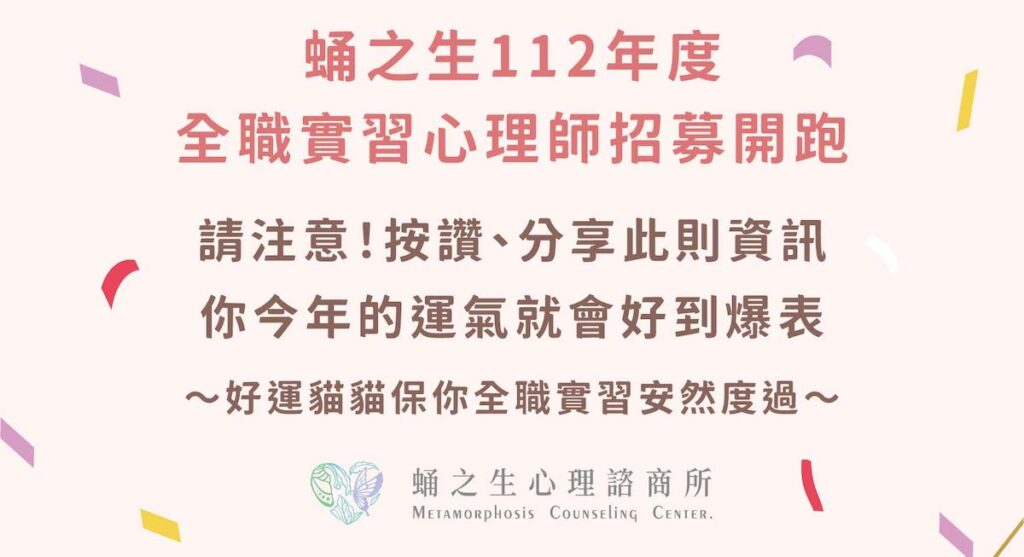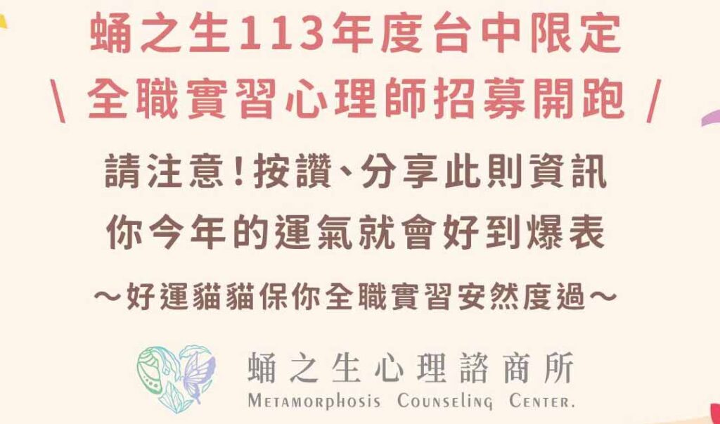 誠徵115年全職實習心理師 2026-01-22 蛹之生誠徵115年度全職實習心理師,本年度徵求2-3名,就讀國內(外)心理、諮商、輔導等相關研究所碩二以上學生,凡是對社區諮商有興趣並已完成兼職實習者,可填寫申請表單報名,截止申請時間:1月28日(三)