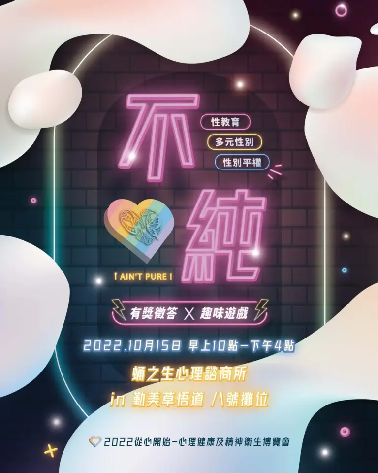 活動上除了衛生局的闖關遊戲與抽獎,蛹之生今年的「不純」攤位也將從性別議題出發,希望透過一系列精心準備的有趣小活動,跟大家互動玩樂外,更期望藉此向大家輕鬆科普LGBTIQ+、性別平權以及性教育的知識~