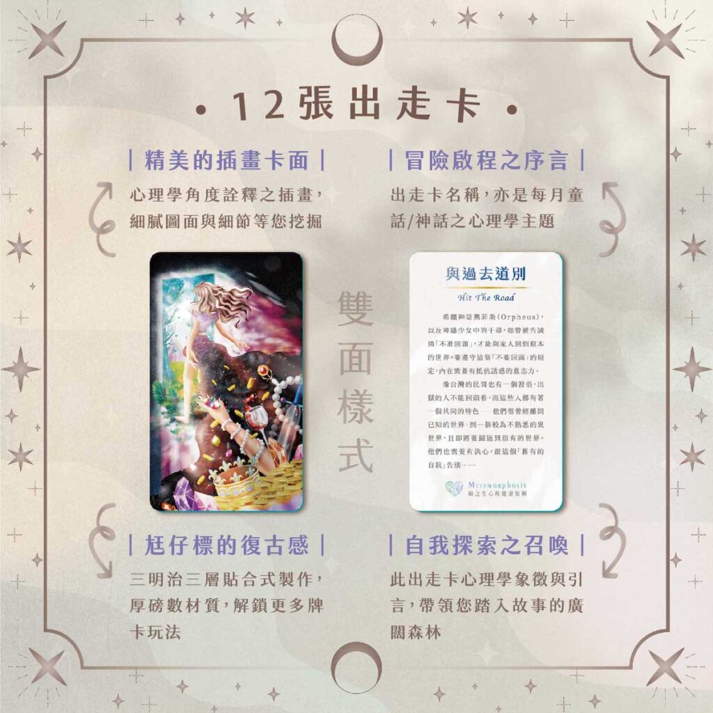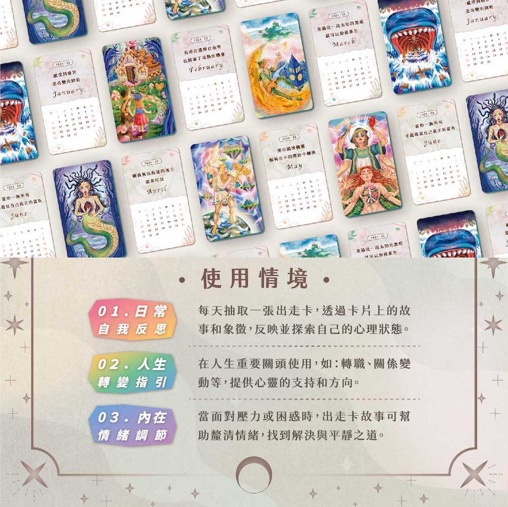 這套出走卡+月曆卡,嘗試以榮格心理學,整理出12個較為重要的「原型」故事。在2024年,我們將以童話和神話的元素,串聯起你的生命旅程,每個月份都有一個獨特的童話、或神話故事伴隨你度過。誠摯邀請你與我們一起,為自己的故事注入蛻變的色彩,讓每月都成為一個新的冒險、讓每張出走卡都成為一個心靈的指南。
