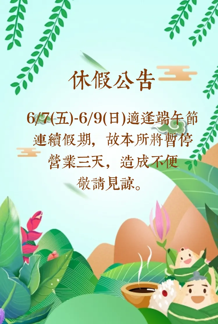 首頁最新消息端午節連假營業時間異動 端午節連假營業時間異動 2019-06-09 各位蛹之友們大家好: 6月7日(五)到6月9日(日)適逢國定假日端午連假。 蛹之生心理諮商所暫停營業三天,如有不便敬請見諒! 6月10日(一)起恢復正常營業。 蛹之生全體人員敬祝大家 ~端午佳節愉快~
