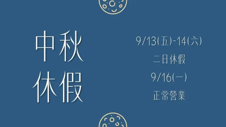 因應國定假日,我們9/13(五)-9/16(六)會暫停營業二天,9/16(一)起正常營業,請大家注意囉!