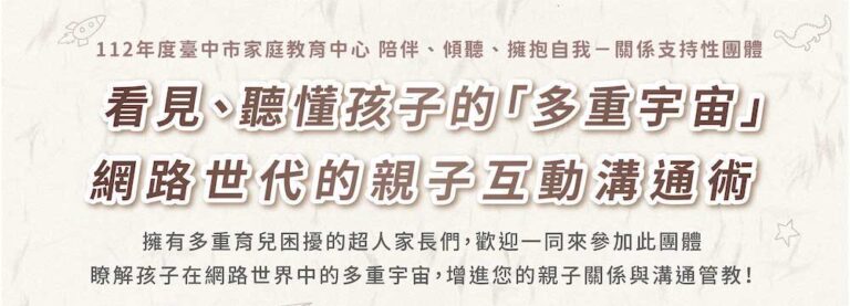 歡迎擁有多重育兒困擾的超人家長們,一同來參加此團體,瞭解孩子在網路世界中的多重宇宙,增進您的親子關係與溝通管教!