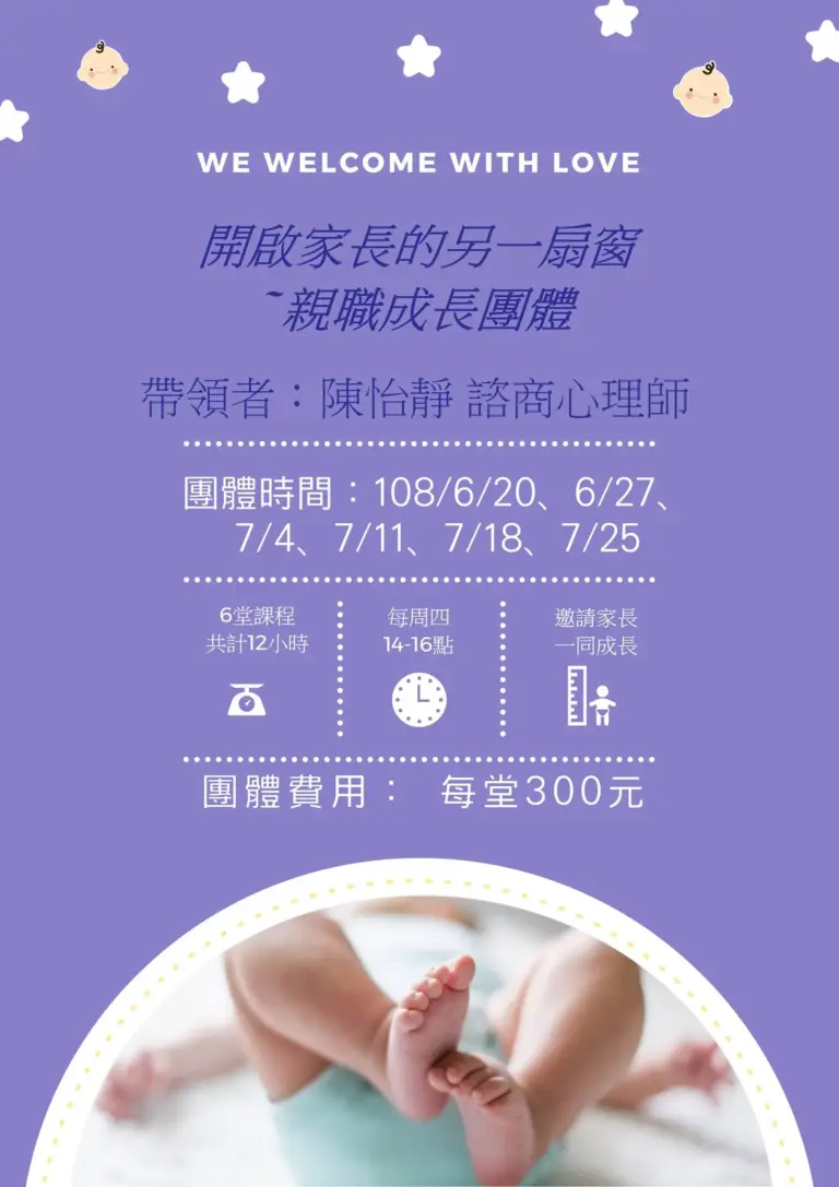 在此次團體中,我們會一起交流面對孩子的挑戰經驗(談在教養過程中,家長的血淚史……)、透過活動體驗的方式學習以大腦的角度理解孩子行為背後的內在狀態、更進一步反思自己的依附關係如何影響親子關係(我們從照顧者那兒承接了什麼帶進自己與孩子的親子關係)、以及學習關係修復的方式,期望藉此能幫助家長發展溫和堅定的教養態度(找回自己的耐性),創造正向的情感交流經驗。