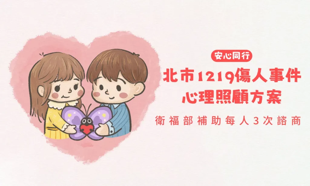 為協助台北市12月19日隨機傷人事件後受到影響的民眾,本單位配合相關主管機關推動「安心同行—北市1219傷人事件心理照顧方案」,提供每人最多 3 次免費心理諮商服務。
